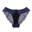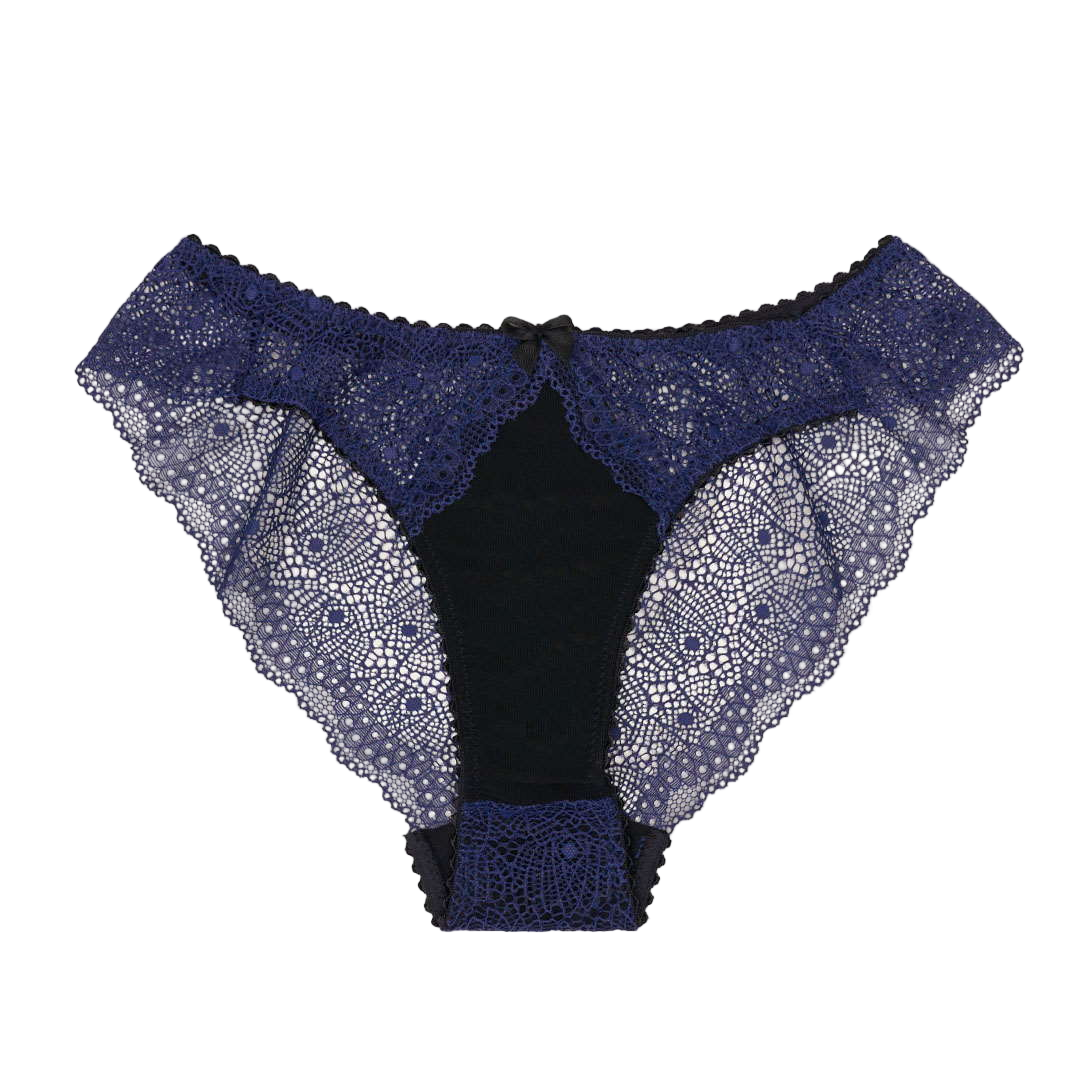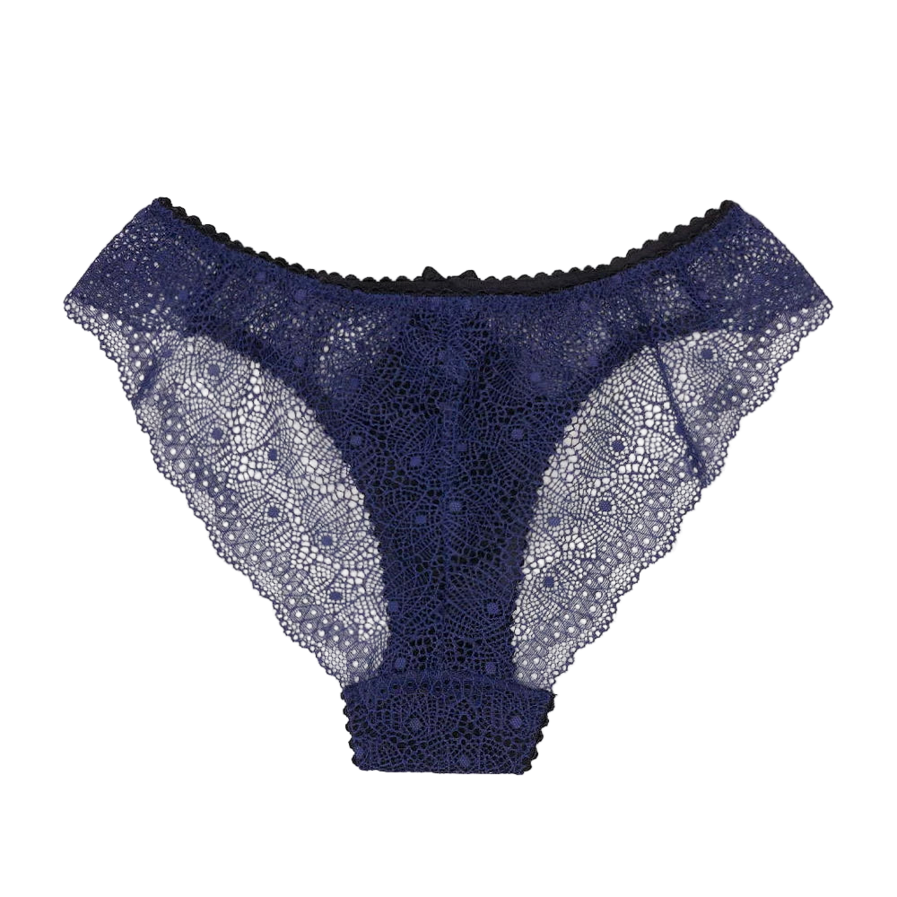 A modern classic, the Myst Bikini combines soft denier with embroidered navy lace for an elegant finish. The back panel is fully detailed with lace, offering both comfort and sophistication. A central bow adds a subtle, playful accent, making this piece the perfect balance of chic and sensual.