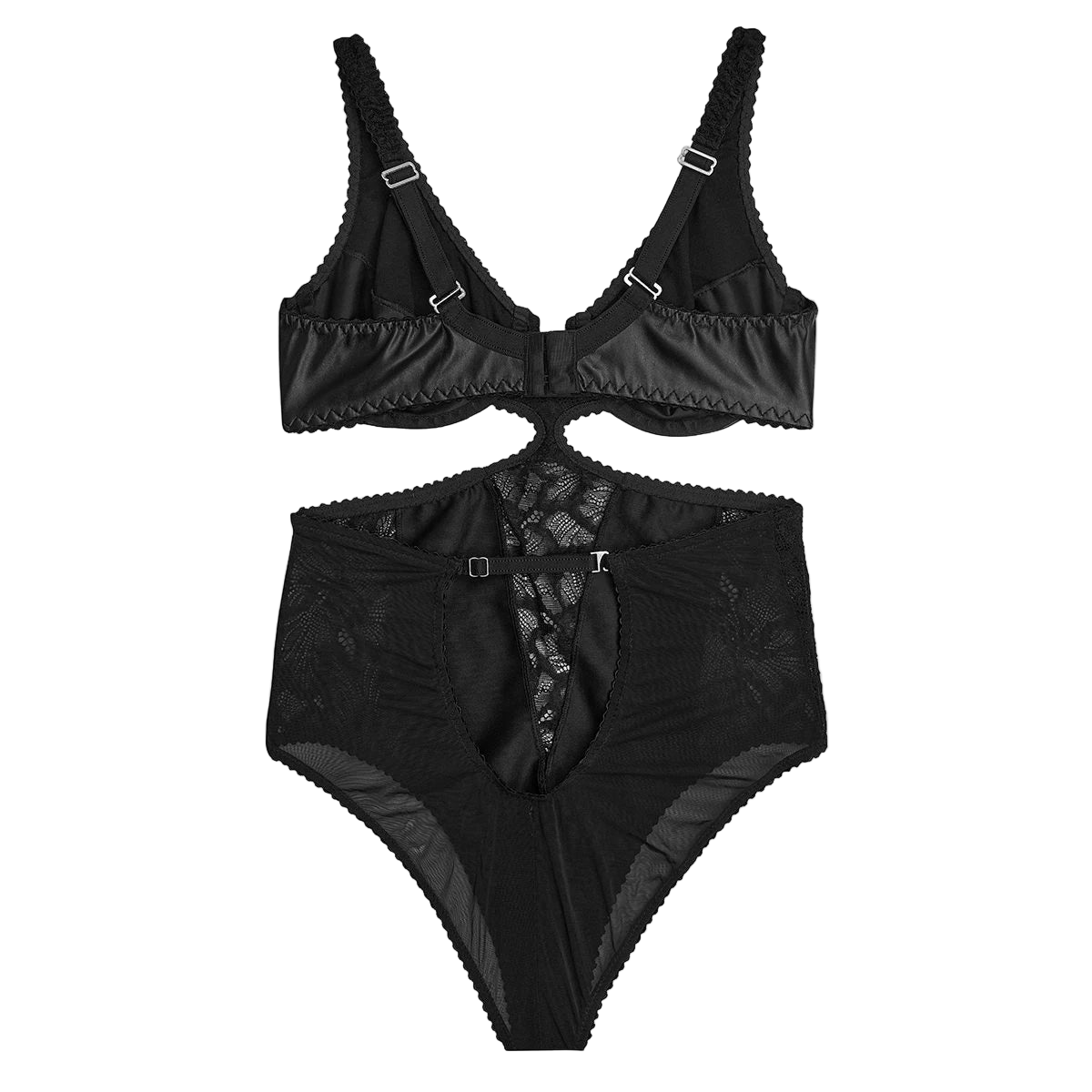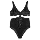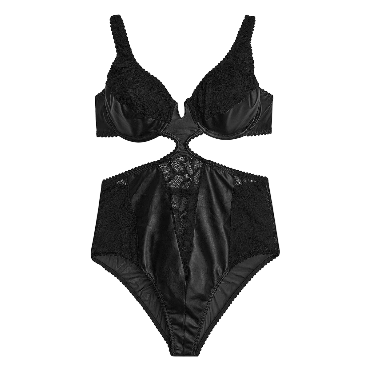 A daring fusion of lace, velvet, and faux leather, this underwire bodysuit sculpts and supports while highlighting every curve. Contrasting textures create a striking balance of softness and edge, making it the perfect statement piece for when you want to feel powerful, seductive, and unforgettable.