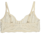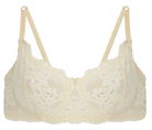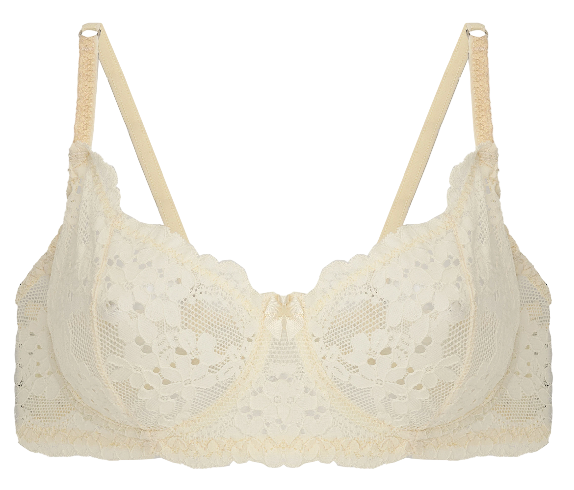 A romantic underwire bra crafted from soft cream lace with delicate scallop trim. Designed with supportive underwire and adjustable straps, it ensures both comfort and shape. Subtle butterfly details add a feminine finish, making it a timeless lingerie staple.