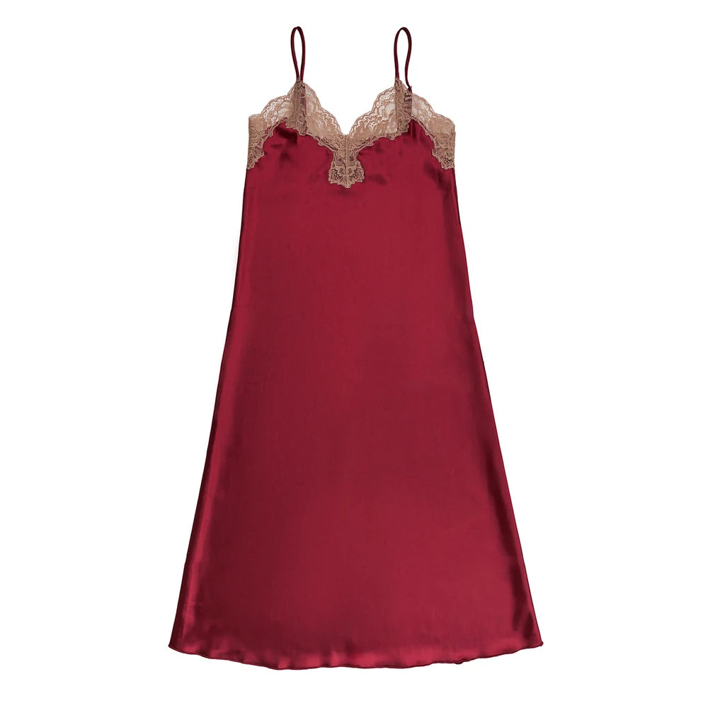 Crafted in fluid scarlet satin, this long slip dress drapes effortlessly over the body, creating a soft, elongated silhouette that moves with grace. The delicate champagne lace neckline adds a romantic contrast, framing the décolletage with timeless elegance.