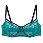 Crafted in sheer turquoise lace with contrasting black trim, this underwire bra sculpts and supports while remaining delicately transparent. The floral embroidery floats over the skin, creating a striking balance between structure and softness.