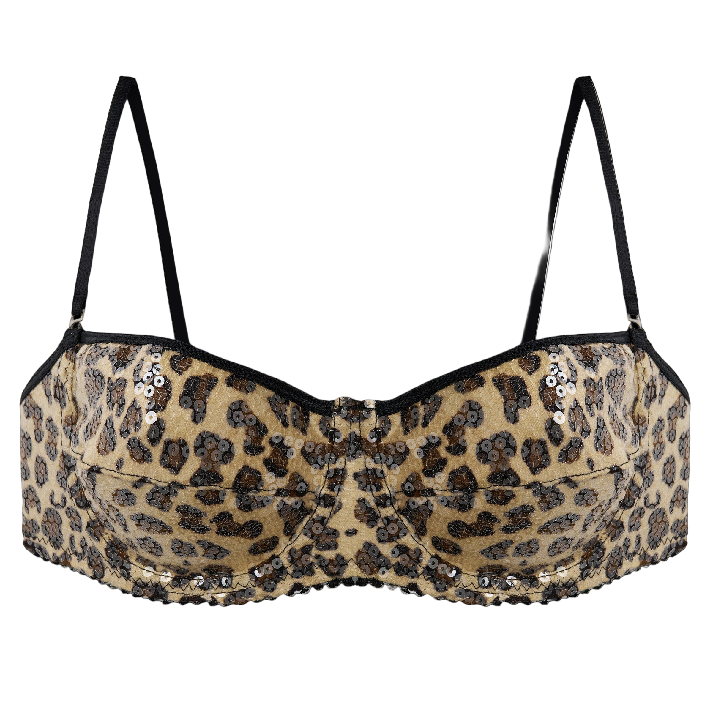 A showstopping balconette bra in shimmering leopard sequin lace. Designed with supportive underwire and slim straps, it blends bold glamour with seductive elegance. Perfect for making a daring statement.