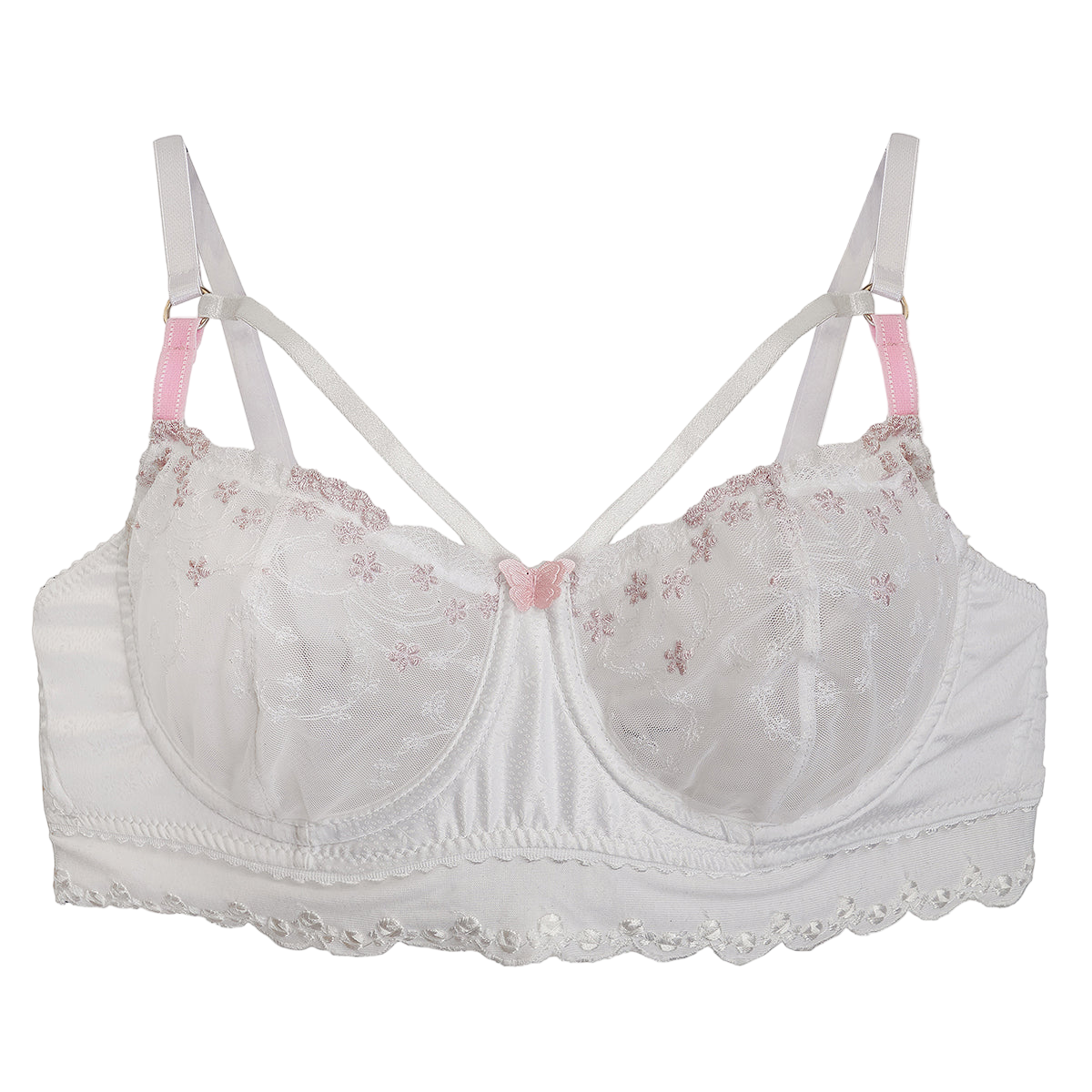 A romantic underwire bra crafted in sheer embroidered tulle with delicate pink floral details. Finished with a soft cotton lace trim and a butterfly charm at the center, it combines gentle support with a dreamy feminine touch.