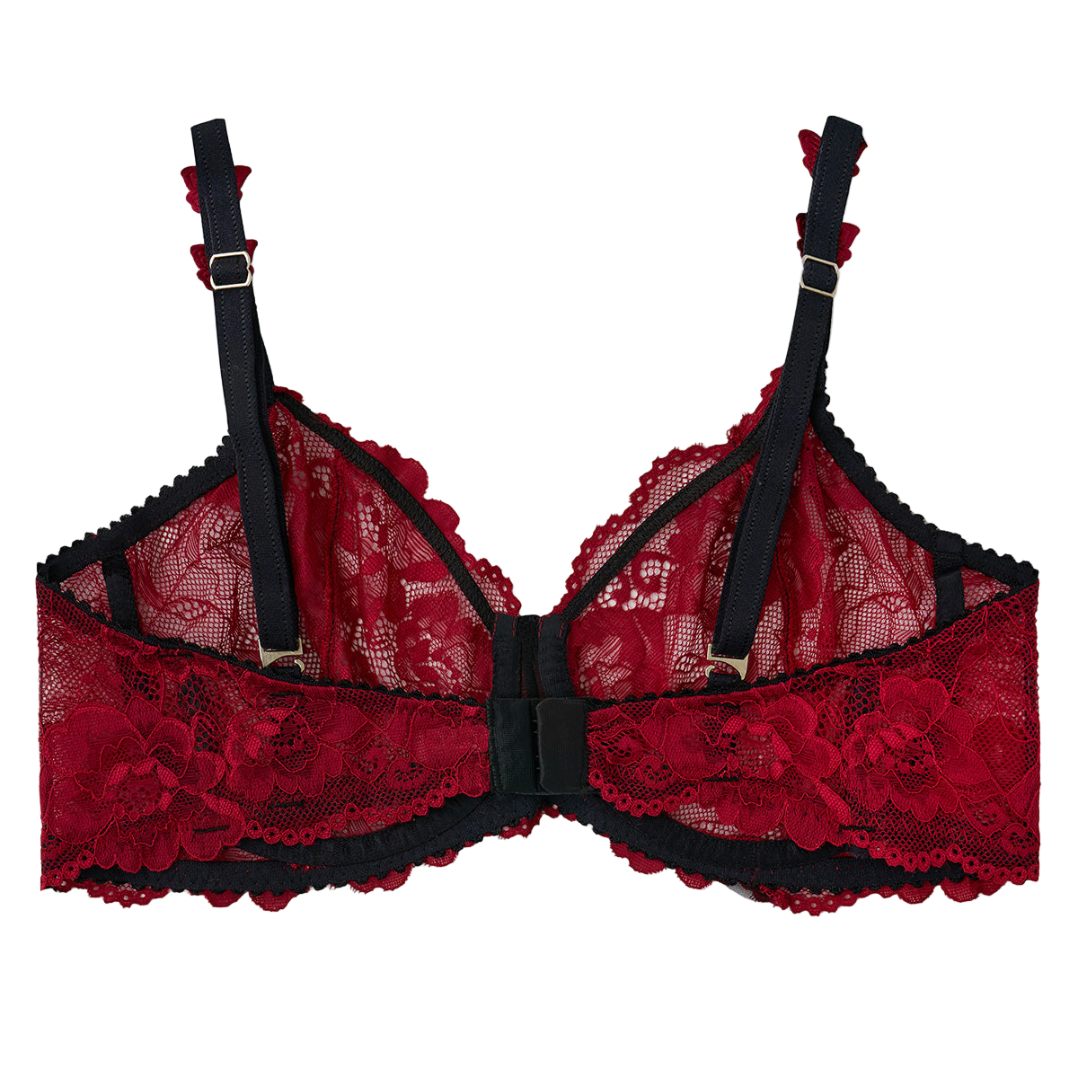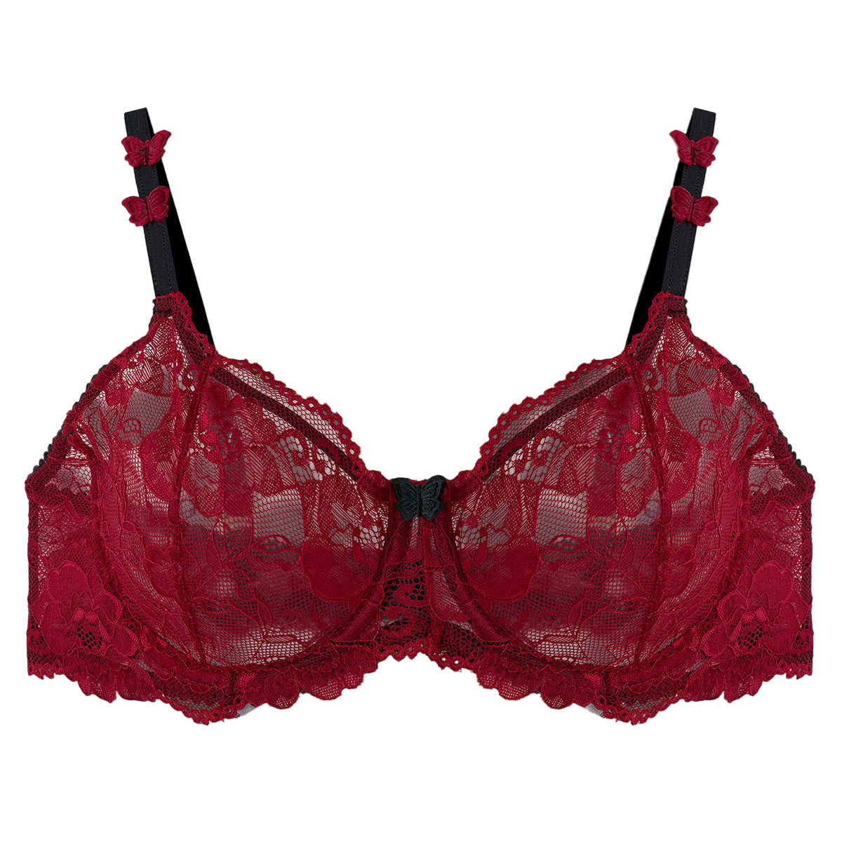 Crafted from rich burgundy lace, the Reign Underwire Bra combines sensual elegance with everyday support. Sheer cups adorned with delicate butterfly details embrace your curves, while adjustable straps ensure the perfect fit. Bold yet romantic, this bra is designed to make you feel confident, alluring, and in command.