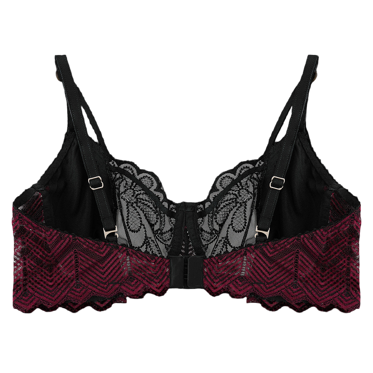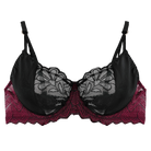Elegance meets allure in this underwire bra, crafted from burgundy satin and floral lace. Its supportive structure and intricate detailing create a flattering silhouette while offering lasting comfort. Adjustable and removable straps provide versatile styling for any occasion.