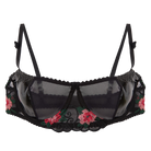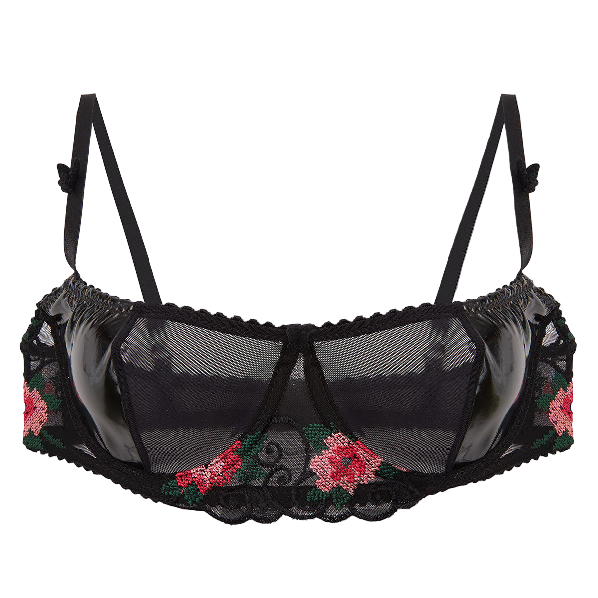 This captivating underwire bra blends edgy vinyl with delicate lace and Swiss-embroidered tulle for a striking contrast. The detachable, adjustable straps provide versatile styling, while the structured cups ensure both support and allure. A bold piece designed to empower and enchant, perfect for those who love lingerie with attitude and elegance.