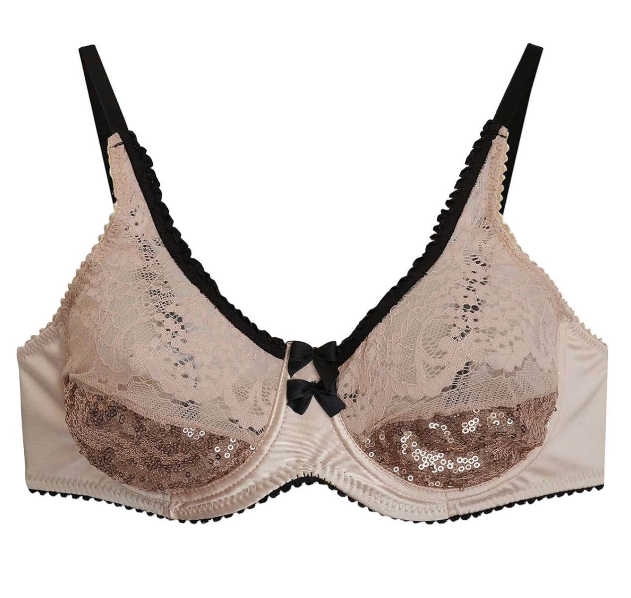 A captivating underwire bra crafted from blush lace and shimmering sequins, blending softness and radiance. Designed with supportive cups, black satin accents, and adjustable straps, it offers both structure and allure. The perfect harmony of elegance and sparkle for moments that feel effortlessly glamorous.