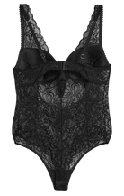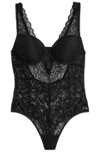 A refined lace bodysuit designed with soft cups for natural comfort and shape. Crafted from sheer black lace, it features adjustable straps and a supportive fit that flatters the silhouette. Perfect as lingerie or styled as an outerwear piece, this bodysuit combines elegance and sensuality with effortless sophistication.