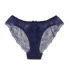 A modern classic, the Myst Bikini combines soft denier with embroidered navy lace for an elegant finish. The back panel is fully detailed with lace, offering both comfort and sophistication. A central bow adds a subtle, playful accent, making this piece the perfect balance of chic and sensual.